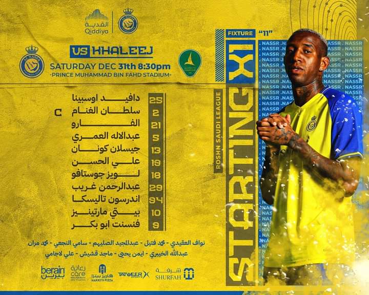 أعلن المدير الفني لفريق النصر، رودي غارسيا، التشكيل الذي سيخوض به مباراته مساء اليوم السبت، أمام نظيره الخليج ضمن منافسات دوري روشن.