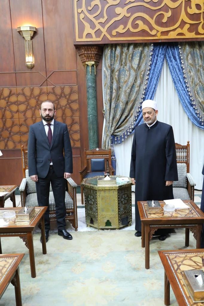 ورحب فضيلةُ الإمام الأكبر وعلماءُ الأزهر بوزير خارجية أرمينيا والوفد الرسمي المرافق له في رحاب الأزهر الشريف، مؤكدًا حرص الأزهر على تعزيز التعاون العلمي والثقافي مع أرمينيا؛ انطلاقًا من العلاقات التاريخية بين مصر وأرمينيا ودور الأزهر الشريف في نشر سماحة الإسلام وقيمه التي تدعو للسلام والتعايش بين الناس على اختلاف معتقداتهم وثقافاتهم.