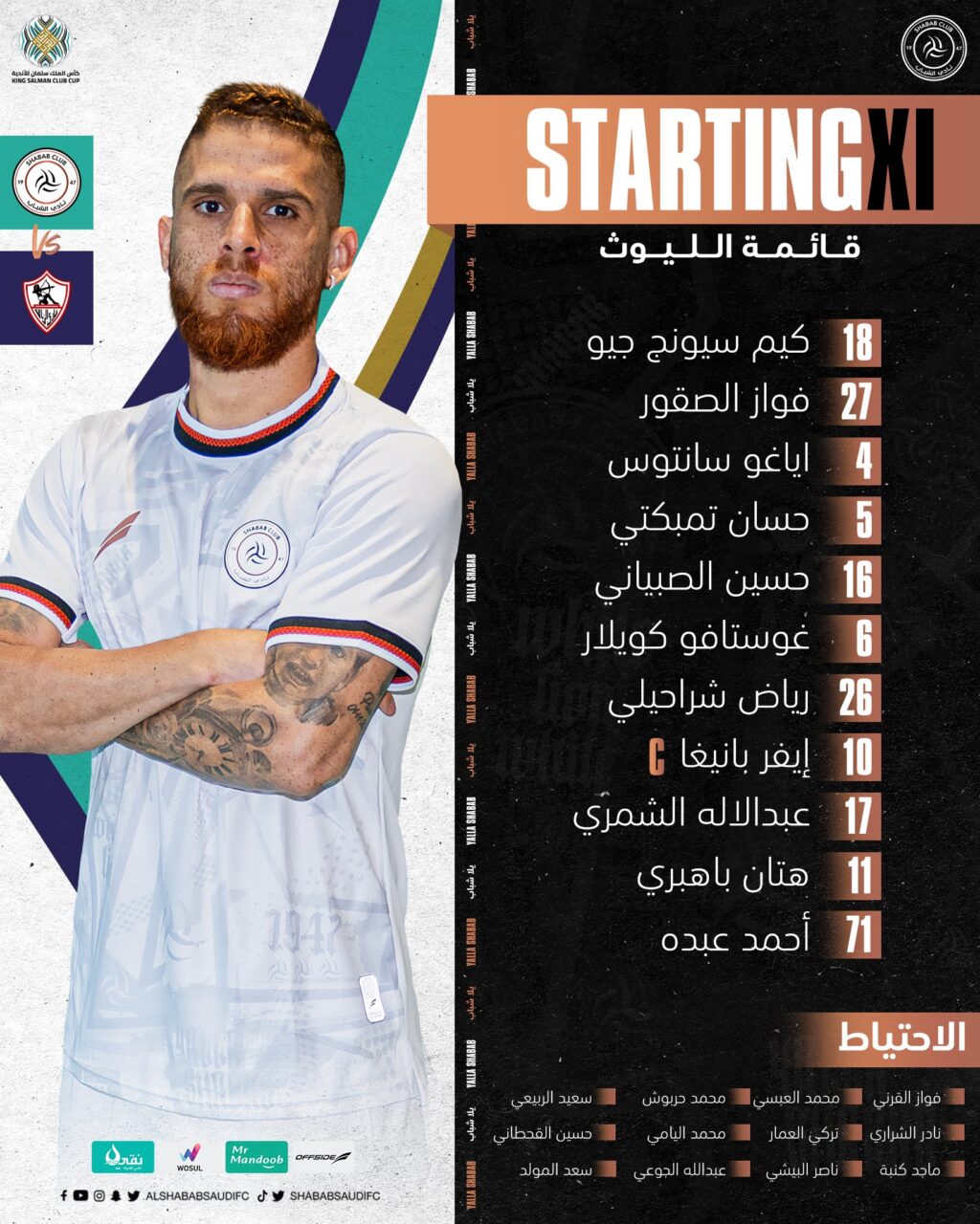 ويدخل الشباب السعودي المواجهة، بقيادة مدربه الجديد، مارسيل كايزر، بالتشكيل الآتي: