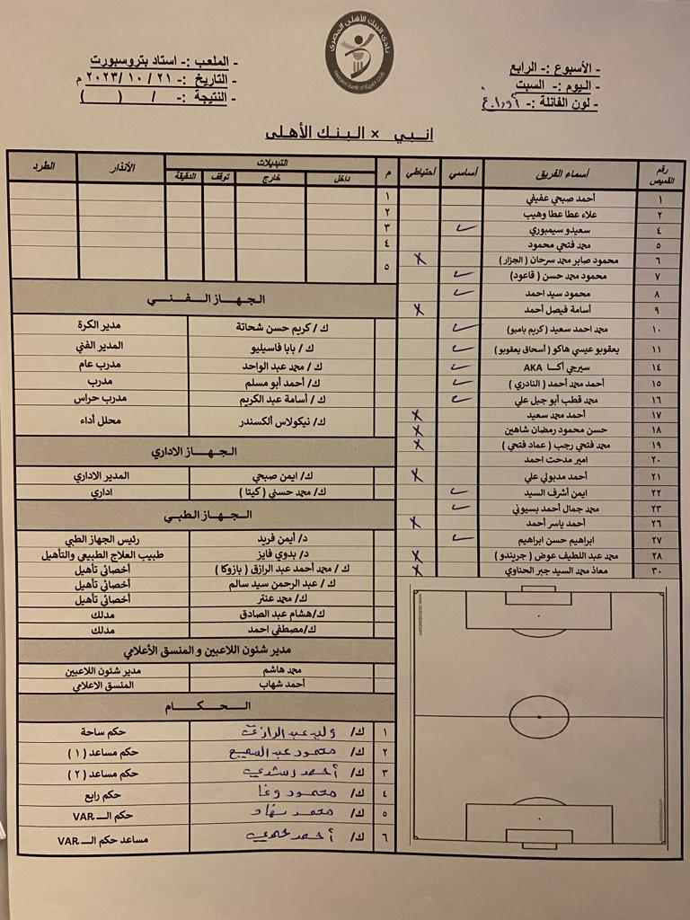 أعلن بابا فاسيليو المدير الفني لفريق الكرة الأول بنادي البنك الأهلي عن تشكيل الفريق لمواجهة إنبى وذلك ضمن مباريات الجولة الرابعة من عمر مسابقة الدوري المصري الممتاز