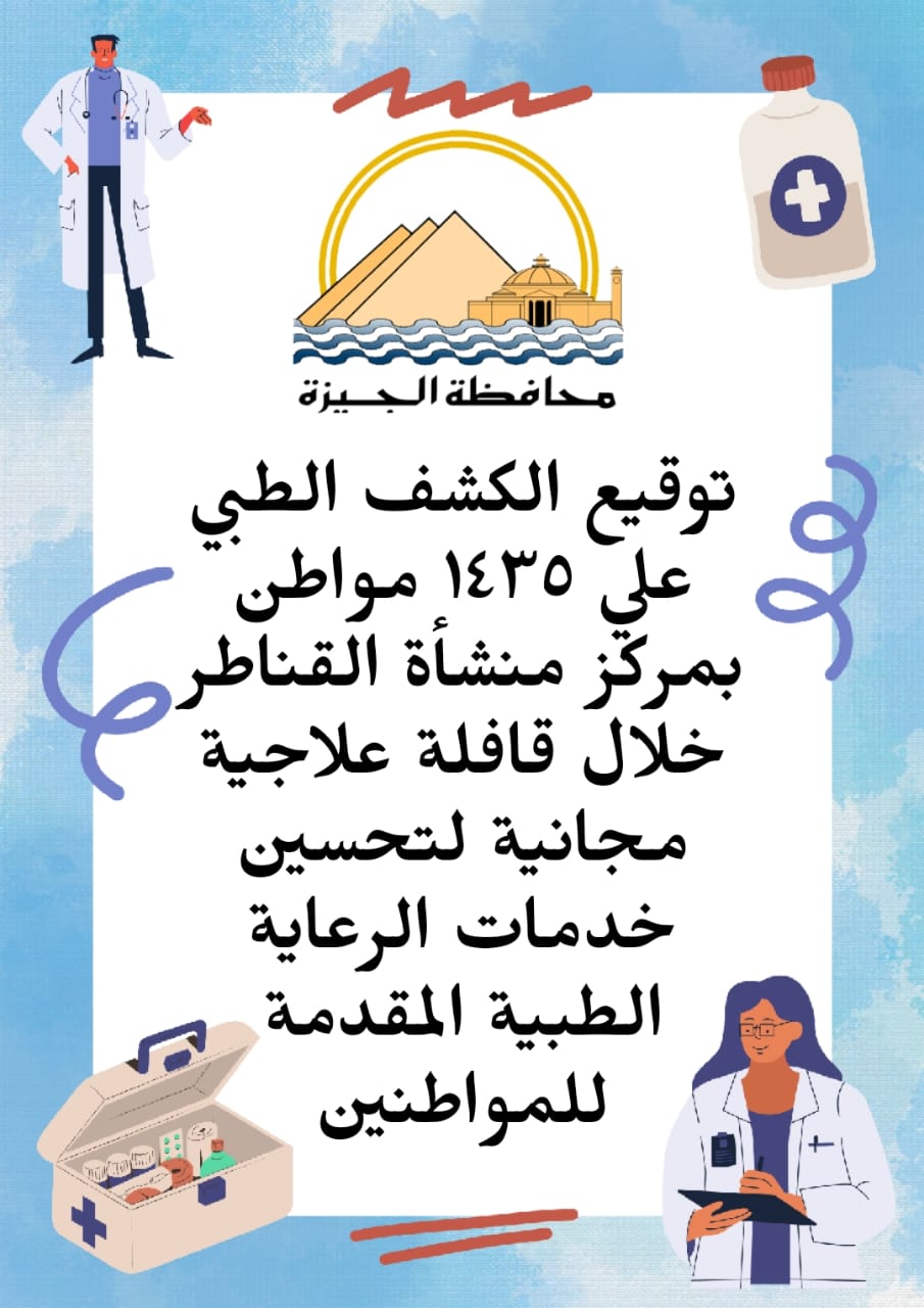 نظمت محافظة الجيزة قافلة طبية شاملة بالتعاون مع مؤسسة ابراهيم احمد بدران لتقديم الخدمات الطبية وصرف العلاج بالمجان لأهالي قرية بهرمس بمركز ومدينة منشأة القناطر بمقر مدرسة درويش الوراقى .
