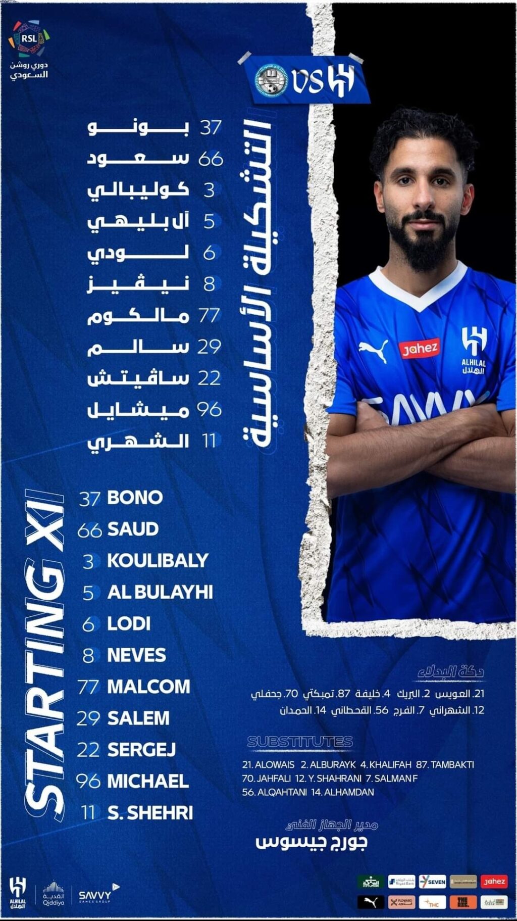 واستقر جيسوس المدير الفني للفريق الأول لكره القدم بنادي الهلال على التشكيل الاتي :
