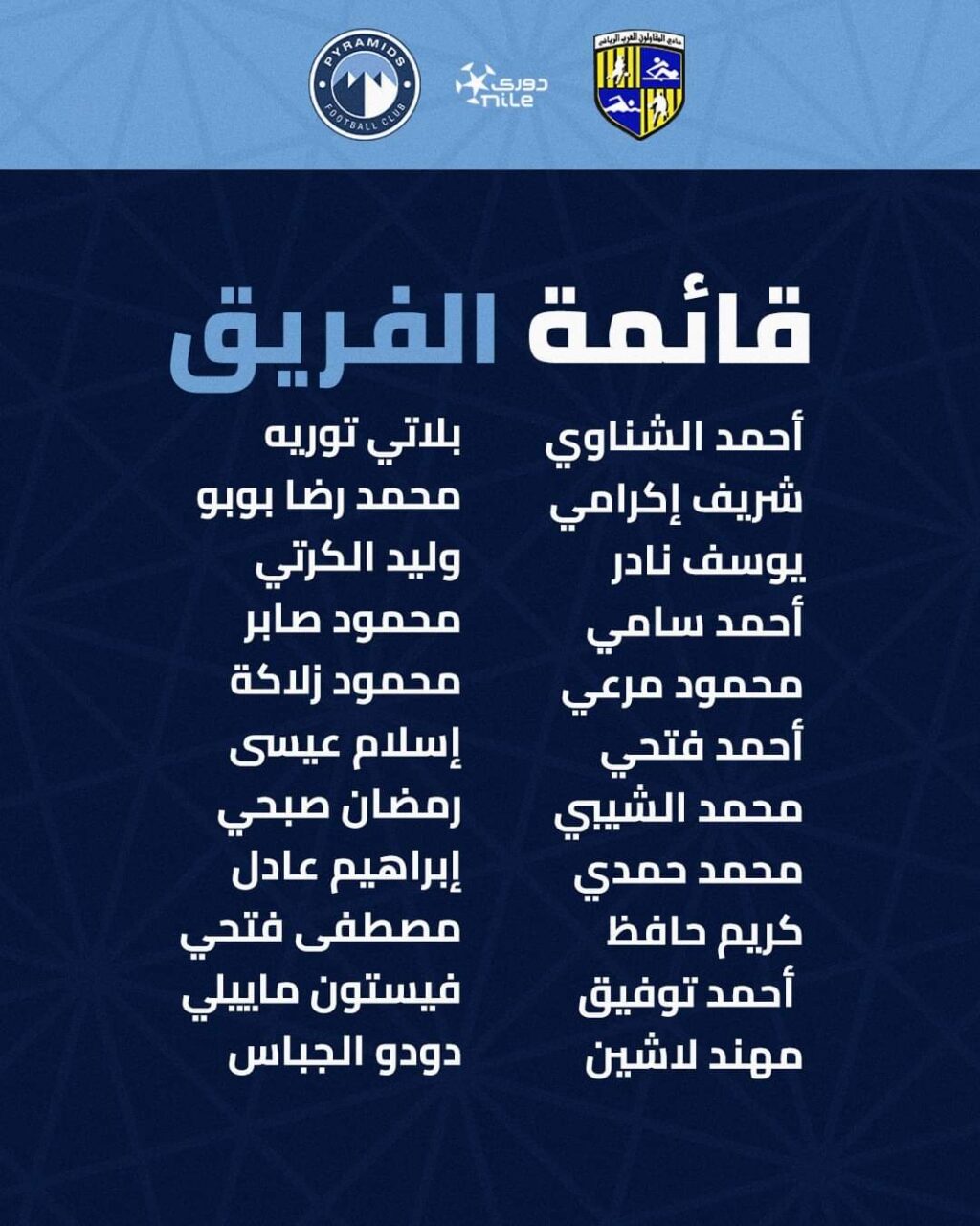 أعلن الكرواتي كرونسلاف يورتشيتش المدير الفني لفريق نادي بيراميدز قائمة مباراة المقاولون العرب في إطار لقاءات الدوري الممتاز.