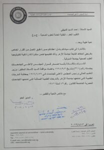 وتقدم لهم بالشكر على ما قدموه من خطابات، وسعة صدر لمساعدتهم لأبنائهم الطلاب والخريجين، حتى تصدر هذه الموافقة، وخاصة أن جامعة المنوفية رفضت قبول أبناء الأزهر، وهو ما دعا الخريجين لتقديم شكوى للنقابة العامة للعلوم الصحية، وبناء عليها تحركت النقابة سرا في هذا الملف، وتم تنسيق لقاء مع الطلبة حضرته النقابة والطلبة، وجاءت أهمية سرية تلك الخطوات، لكي لا يظهر ما يجهض جهودها منذ يونيو الماضي، وهو نفس المنهج الذي تنتهجه النقابة دائما في ملفاتها لكي لا تظهر أي تحديات غير محسوبة تعرقل سير الإجراءات والملفات المختلفة.