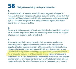 وأضاف: “مادة 58 فقرة 3 من النظام الأساسي للفيفا لا تحظر اللجوء الى القضاء العادي في الحالات التي تخرج عن اختصاص الاتحادات، طالما هناك نص قانوني ملزم باختصاص المحكمة الحصري مثل نظر الدعوى الجنائية. و هو الذي تحترمه الفيفا و في كافة الدول دون اعتبار هذا مخالفا للوائح الفيفا”.