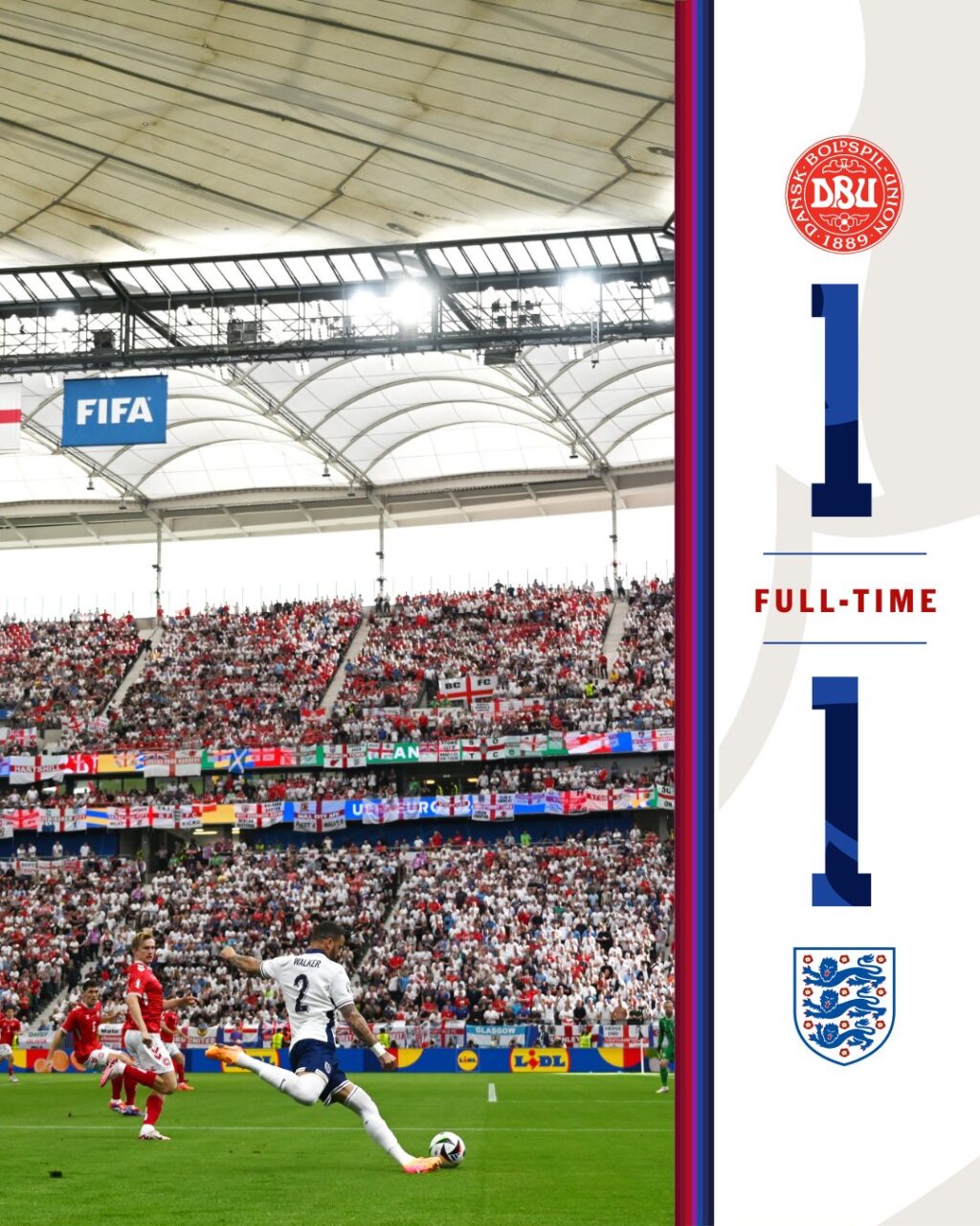 وبهذه النتيجة ينتهي اللقاء بهدف لمثله للمنتخبين، ورغم التعادل يبقى منتخب إنجلترا في قمة المجموعة برصيد 4 نقاط، بينما يأتي منتخب الدنمارك في المركز الثالث ويملك نقطتين فقط.