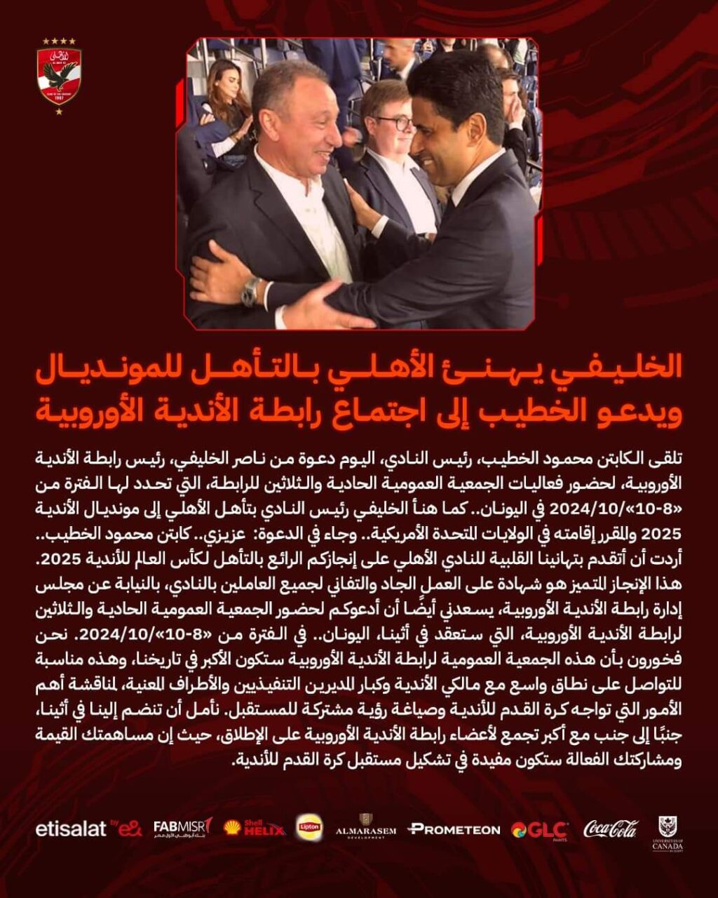 عزيزي.. كابتن محمود الخطيب.. أردت أن أتقدم بتهانينا القلبية للنادي الأهلي على إنجازكم الرائع بالتأهل لكأس العالم للأندية 2025. هذا الإنجاز المتميز هو شهادة على العمل الجاد والتفاني لجميع العاملين بالنادي، بالنيابة عن مجلس إدارة رابطة الأندية الأوروبية، يسعدني أيضًا أن أدعوكم لحضور الجمعية العمومية الحادية والثلاثين لرابطة الأندية الأوروبية، التي ستعقد في أثينا، اليونان.. في الفترة من «8-10»/10/2024. نحن فخورون بأن هذه الجمعية العمومية لرابطة الأندية الأوروبية ستكون الأكبر في تاريخنا، وهذه مناسبة للتواصل على نطاق واسع مع مالكي الأندية وكبار المديرين التنفيذيين والأطراف المعنية، لمناقشة أهم الأمور التي تواجه كرة القدم للأندية وصياغة رؤية مشتركة للمستقبل. نأمل أن تنضم إلينا في أثينا، جنبًا إلى جنب مع أكبر تجمع لأعضاء رابطة الأندية الأوروبية على الإطلاق، حيث إن مساهمتك القيمة ومشاركتك الفعالة ستكون مفيدة في تشكيل مستقبل كرة القدم للأندية.