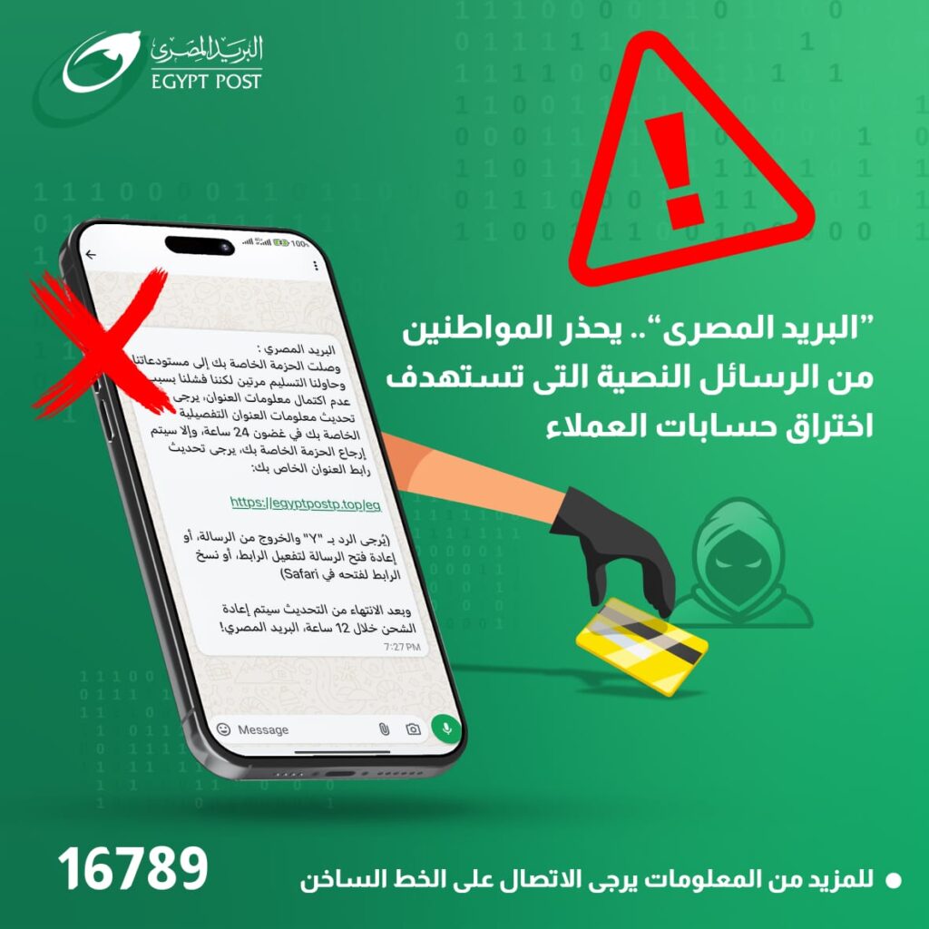 ويدعو البريد المصري جميع المواطنين إلى عدم التفاعل مع مثل هذه الرسائل، أو الضغط على أي روابط ترد من أرقام مجهولة، وفي حال ورود أي استفسارات أو شكاوى يرجى الاتصال بالخط الساخن 16789.