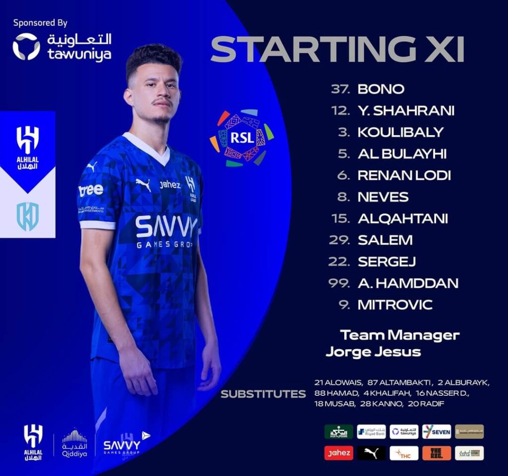 أعلن جورجي جيسوس المدير الفني للفريق الكروي الأول بنادي الهلال، تشكيل فريقه الرسمي لمواجهة الاخدود، في التاسعة مساء اليوم السبت، ضمن منافسات دوري روشن السعودي.