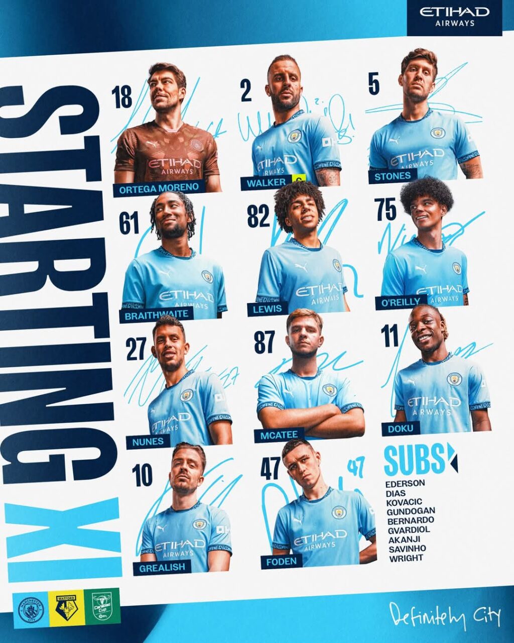 ويجلس على مقاعد البدلاء كلًا من إيدرسون، روبن دياز، ماتيو كوفاسيتش، إلكاي جوندوجان، برناردو سيلفا، يوسكو جفارديول، مانويل أكانجي، سافينيو ورايت.