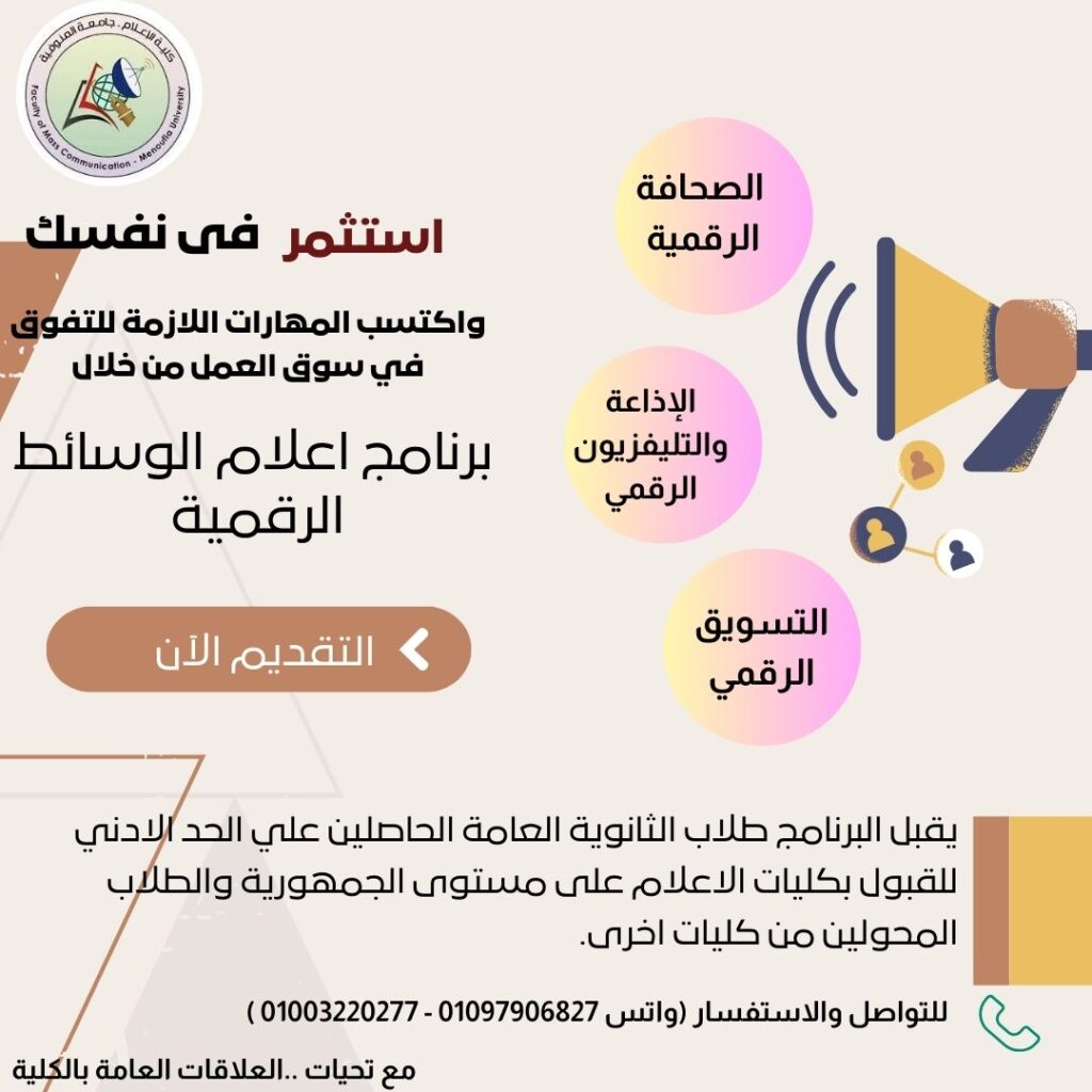 أصدر الدكتور أيمن عاشور وزير التعليم العالى والبحث العلمى، قرارا وزاريا ببدء الدراسة ببرنامج اعلام الوسائط الرقمية برنامج مميز بمصروفات العام الجامعي الحالي ٢٠٢٥/٢٠٢٤ ياتي ذلك فى إطار سعى جامعة المنوفية لمواكبة كل ما هو جديد بدعم ورعاية الدكتور أحمد فرج القاصد رئيس الجامعة والدكتور ناصر عبدالباري نائب رئيس الجامعة لشئون التعليم والطلاب لتعزيز التميز الأكاديمى والارتقاء بالمستوى العملي والمهني للطلاب .