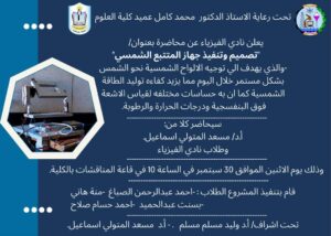 نظم نادى الفيزياء صباح اليوم بقاعة المؤتمرات بالكلية بالتعاون مع قسم العلاقات العامة والاعلام محاضرة بعنوان “تصميم وتنفيذ المتتبع الشمسي”، تحت رعاية الاستاذ الدكتور محمد كامل فرح عميد كلية العلوم، حاضر فيها الاستاذ الدكتور مسعد المتولى وطلاب نادى الفيزياء ، وباشراف الاستاذ الدكتور وليد مسلم والاستاذ الدكتور مسعد المتولى .
