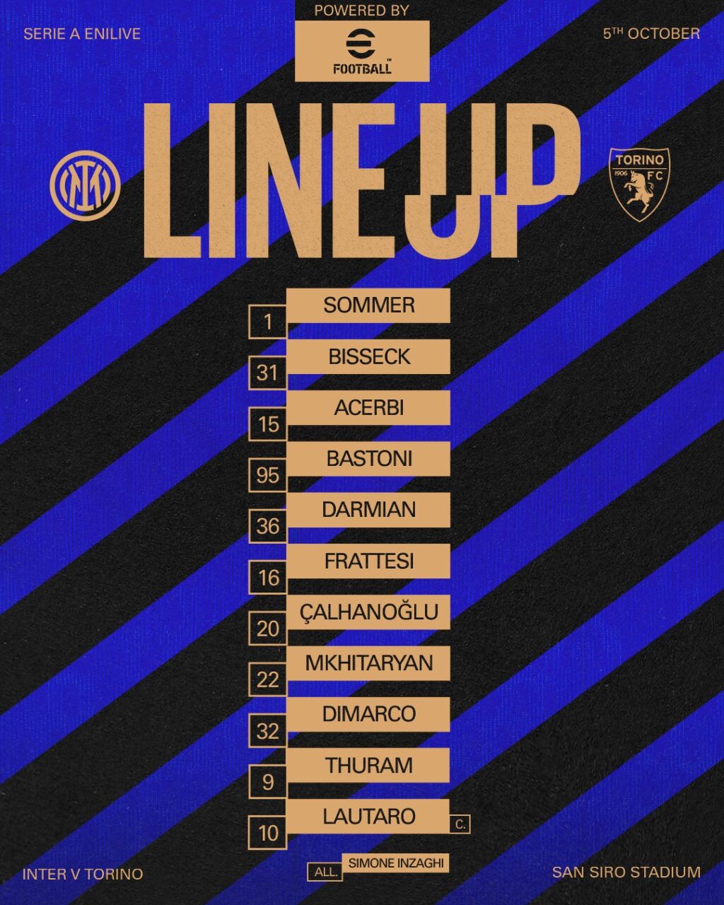 وقد وضع سيموني إنزاجي المدير الفني لفريق إنتر ميلان تشكيله فريقه الأساسي استعدادًا لهذه المواجهة، وقد جاء التشكيل على النحو التالي :