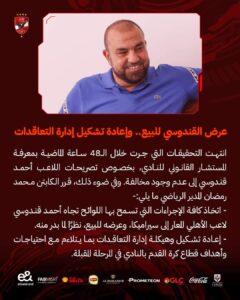 – اتخاذ كافة الإجراءات التي تسمح بها اللوائح تجاه أحمد قندوسي لاعب الأهلي المعار إلى سيراميكا، وعرضه للبيع، نظرًا لما بدر منه.