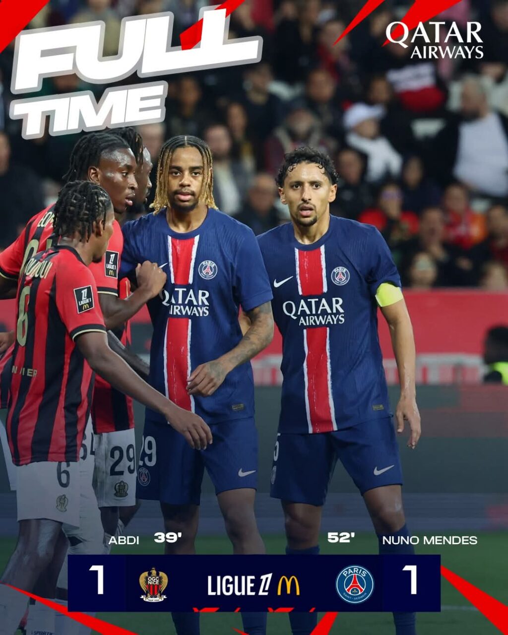 تعادل الفريق الكروي الأول بنادي باريس سان جيرمان، مع مضيفه نيس، بهدف لمثله، في المباراة التي أقيمت بينهما مساء الأحد، ضمن منافسات الدوري الفرنسي.
