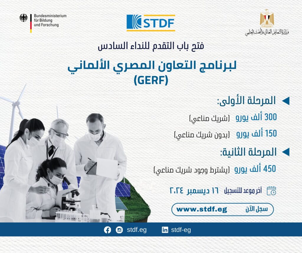 وفي هذا الإطار، أعلنت هيئة تمويل العلوم والتكنولوجيا والابتكار (STDF)، عن فتح باب التقدم لبرنامج التعاون المصري الألماني (GERF)، بهدف تعزيز الربط بين البحث العلمي والصناعة، بما يدعم جهود مصر في الابتكار التكنولوجي، وبناء شراكات قوية وطويلة الأمد بين المؤسسات البحثية والكيانات الصناعية.