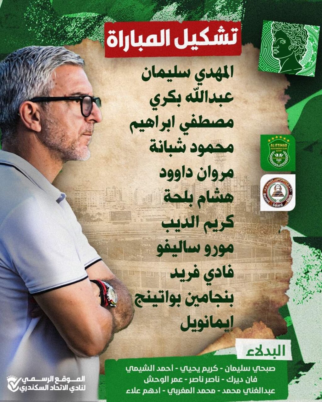 وأعلن نيكوديموس بابافاسيليو المدير الفني لفريق الاتحاد السكندري عن تشكيل فريقه لمواجهة اليوم وجاء التشكيل كالآتي :