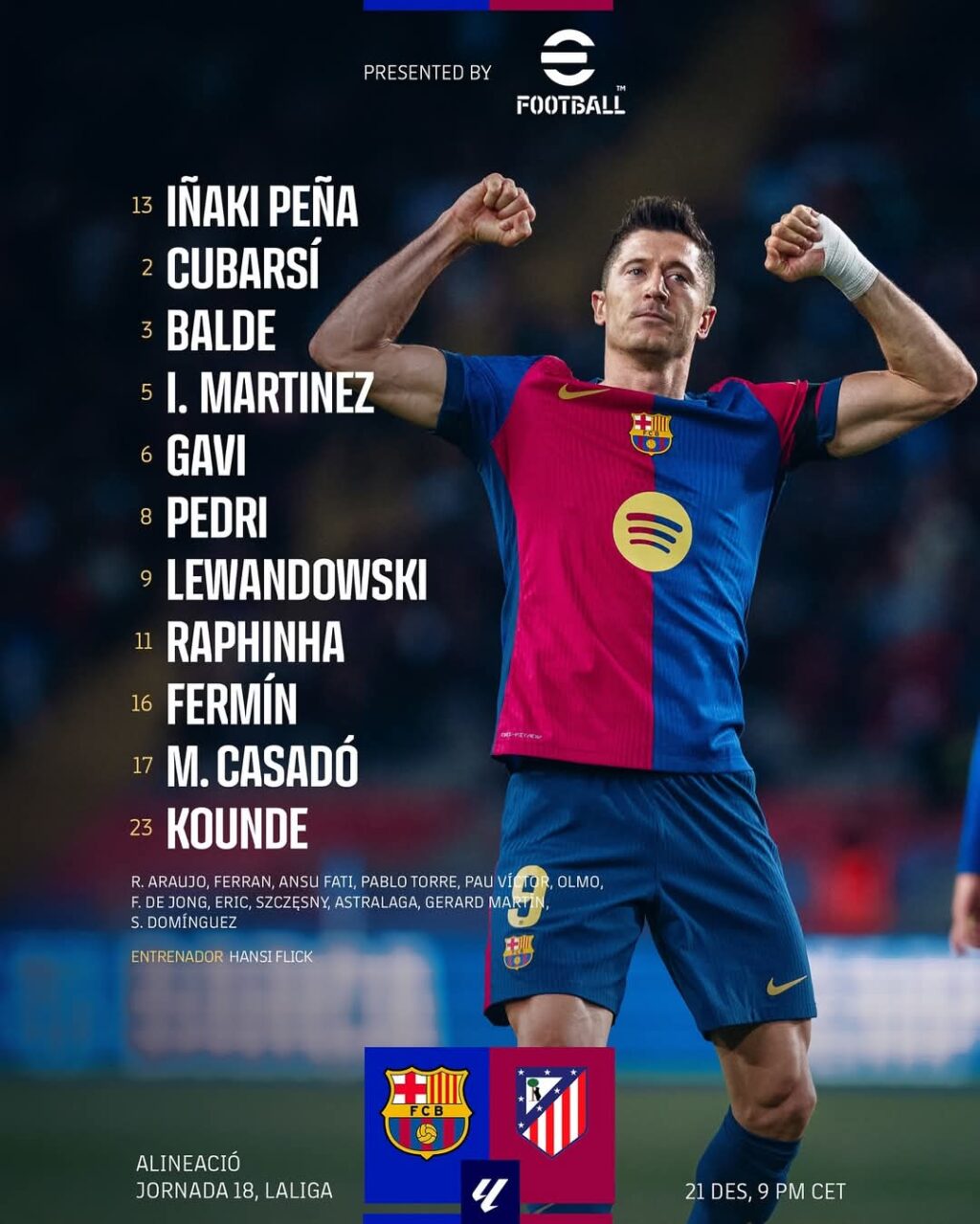 أعلن هانزي فليك، المدير الفني للفريق الأول بنادي برشلونة، عن تشكيل فريقه لمواجهة أتليتكو مدريد، المقرر لها اليوم السبت في العاشرة مساءً، ضمن منافسات الـ18 بالدوري الإسباني