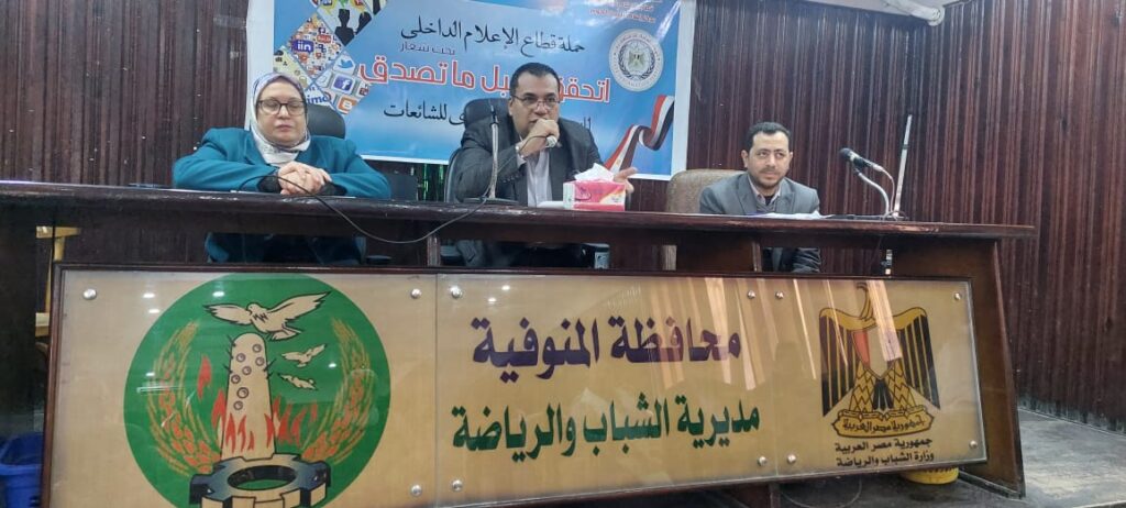 فى هذا الاطار عقد مركز اعلام شبين الكوم برئاسة مها ابو حطب صباح اليوم ندوة بعنوان (إدارة الأزمات وآليات التصدى للشائعات) بمقر مديرية الشباب والرياضة بالمنوفية.