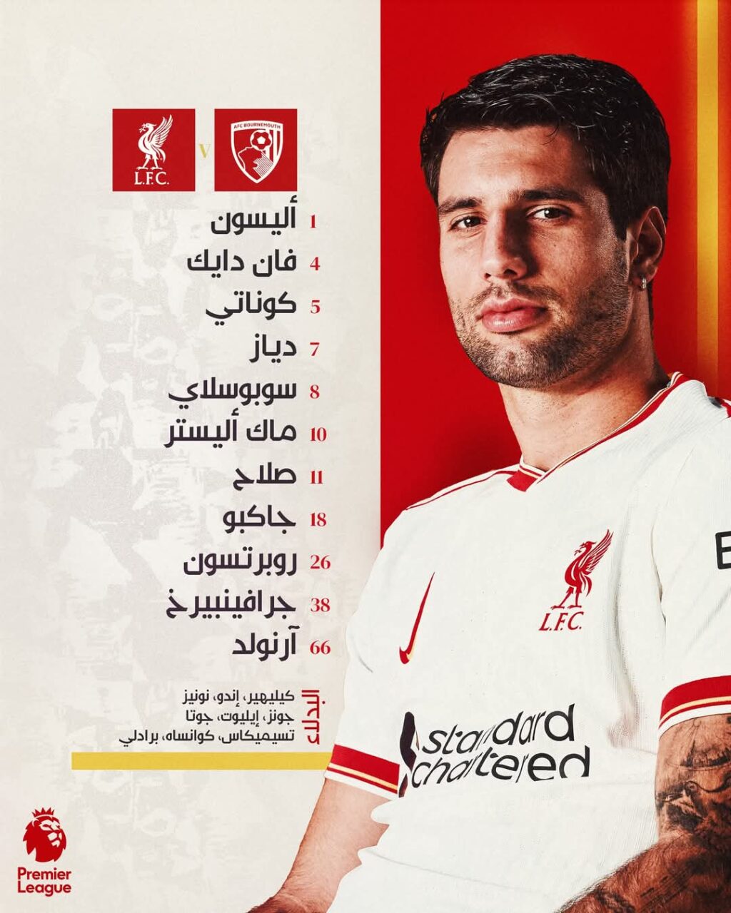 أعلن آرني سلوت، المدير الفني لفريق ليفربول ضد بورنموث، مساء السبت ، في إطار منافسات الجولة الـ 24 من بطولة الدوري الإنجليزي، الممتاز لكرة القدم للموسم الجاري 2024 – 2025.