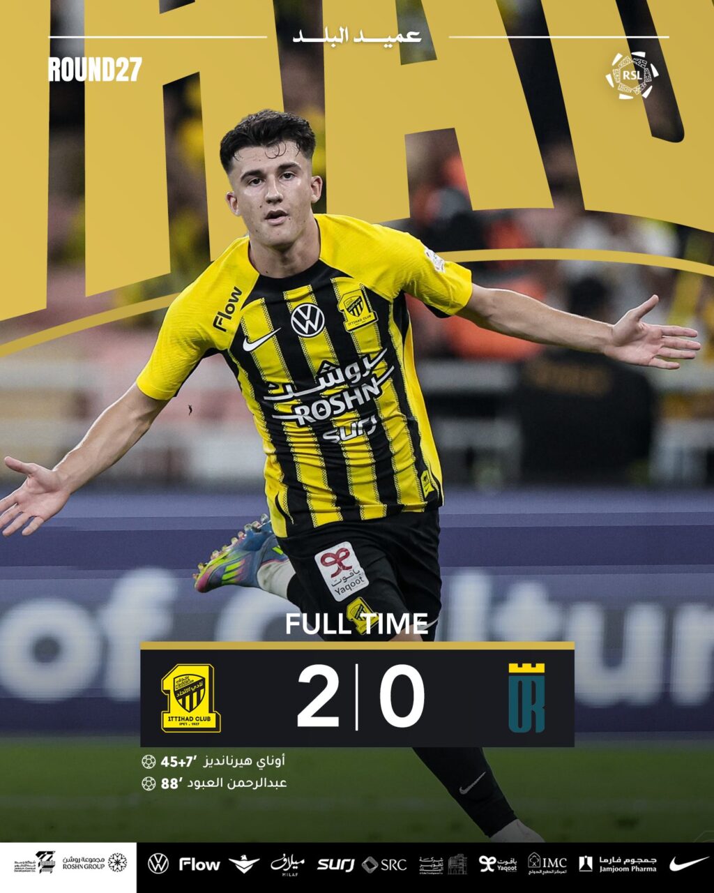 ثم يضيف فريق الاتحاد الهدف الثاني في الدقيقة 88، وجاء بأقدام اللاعب عبد الرحمن العبود.