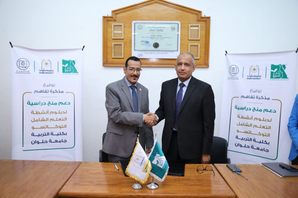وقّعت مؤسسة مصر الخير، عضو التحالف الوطني للعمل الأهلي التنموي، بروتوكول تعاون مع كلية التربية – جامعة حلوان، لتمويل ودعم منح دراسية لعدد ٤٠ طالبًا وطالبة للحصول على دبلوم مهني في تخصص “أنشطة التعلم الشامل – التوكاتسو”، بالإضافة إلى دعم العديد من المجالات التربوية والتعليمية، مثل كتابة المقترحات التمويلية، وتنفيذ المشروعات الدولية، والمنح الدراسية، والنشر العلمي والأكاديمي في الموضوعات ذات الأهمية المشتركة.
