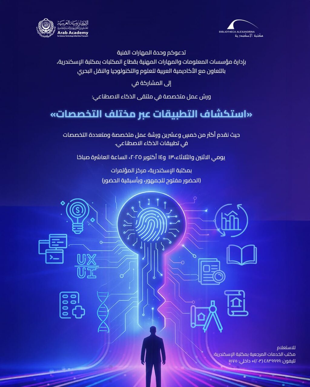 تنظم مكتبة الإسكندرية من خلال وحدة المهارات الفنية بإدارة مؤسسات المعلومات والمهارات المهنية بقطاع المكتبات، وبالتعاون مع عمادة القبول والتسجيل بالأكاديمية العربية للعلوم والتكنولوجيا والنقل البحري، وتحت إشراف الأستاذ الدكتور محمد عصام خضر، فعاليات التعاون بين المؤسستين للعام الثالث على التوالي ضمن موسم 2025م. والتي تتمثل في ورش عمل متخصصة تُعقد ضمن ملتقى الذكاء الاصطناعي بعنوان “استكشاف التطبيقات عبر مختلف التخصصات”، وذلك في تمام الساعة العاشرة صباحًا، على مدار يومي الاثنين والثلاثاء 13 و14 أكتوبر 2025م.