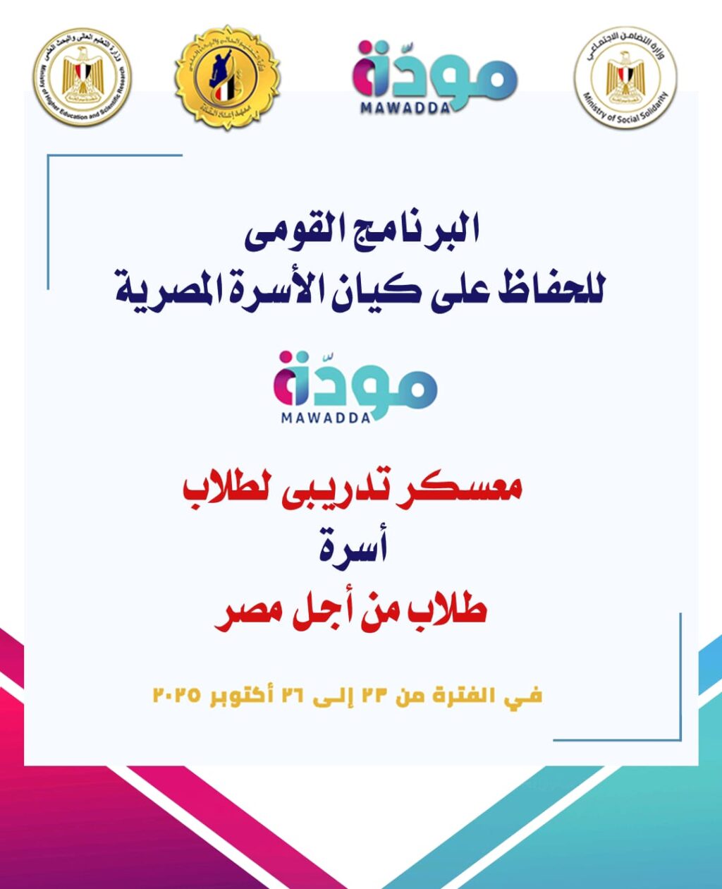 في إطار التعاون المشترك بين وزارتي التعليم العالي والبحث العلمي ووزارة التضامن الاجتماعي، تنطلق اليوم فعاليات المعسكر التدريبي لأعضاء أسرة طلاب من أجل مصر، ضمن البرنامج القومي للحفاظ على كيان الأسرة المصرية (مودة)، وذلك بمعهد إعداد القادة والذي يستمر خلال الفترة من 23 إلى 26 أكتوبر.