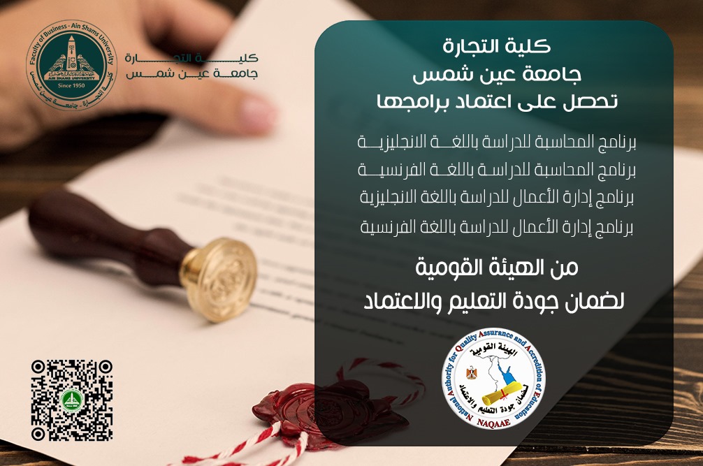 في حدث أكاديمي غير مسبوق، حصلت كلية التجارة بجامعة عين شمس على اعتماد أربعة من برامجها المتميزة، وهي: برنامج إدارة الأعمال للدراسة باللغة الإنجليزية، برنامج إدارة الأعمال للدراسة باللغة الفرنسية، برنامج المحاسبة للدراسة باللغة الإنجليزية، وبرنامج المحاسبة للدراسة باللغة الفرنسية.