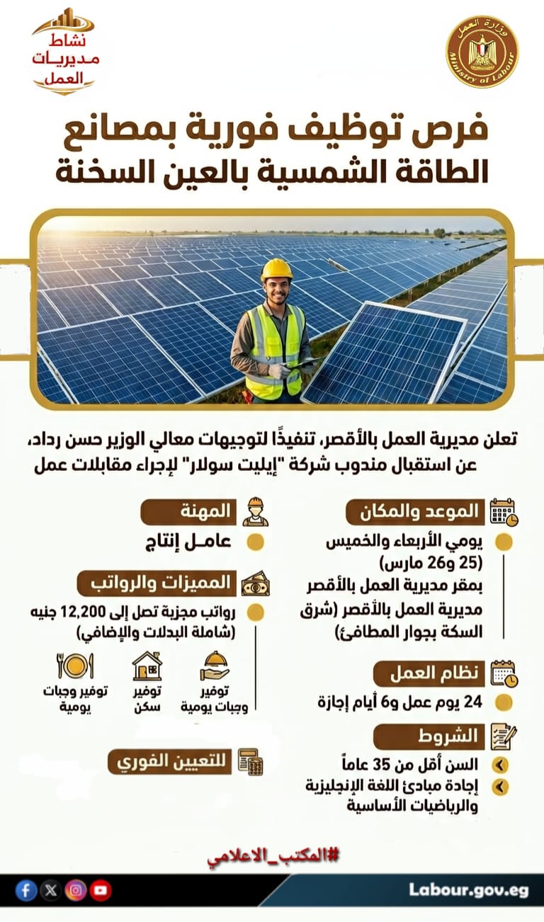 تنفيذًا لتوجيهات الوزير حسن رداد والمحافظ عبد المطلب عمارة ،أعلن محمود باسل، مدير مديرية عمل الأقصر، عن استقبال مندوب شركة “إيليت سولار” بمقر المديرية (شرق السكة بجوار المطافئ) يومي الأربعاء والخميس (25 و26 مارس) لإجراء مقابلات على مهنة “عامل إنتاج”،وذلك لأبناء المحافظة … تشمل الفرص المتاحة رواتب مجزية تصل إلى 12,200 جنيه (شاملة البدلات والإضافي)، مع توفير سكن ووجبات يومية ونظام عمل (24 يوم عمل و6 أيام إجازة)…. يُشترط السن أقل من 35 عاماً وإجادة مبادئ اللغة الإنجليزية والرياضيات الأساسية،وذلك للتعيين الفوري بمقر الشركة بالمنطقة الصينية “تيدا” بالعين السخنة.