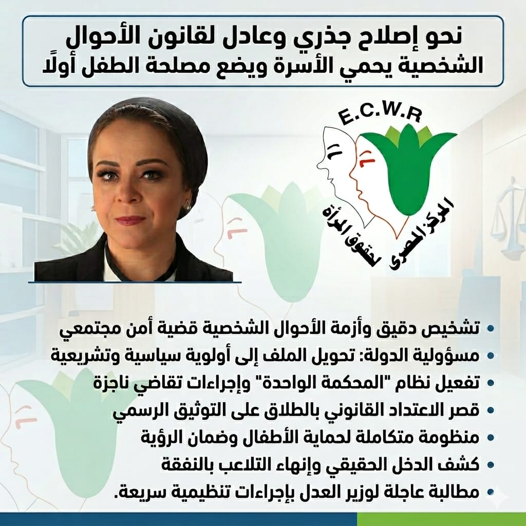 يجدد المركز مطالبته باتخاذ إجراءات تنظيمية عاجلة لا تتطلب انتظار تعديلات تشريعية، وعلى رأسها إصلاح آليات العمل داخل محاكم الأسرة لتسريع الفصل في القضايا، وضمان تنفيذ الأحكام بكفاءة، باعتبار ذلك حجر الأساس لأي إصلاح حقيقي.