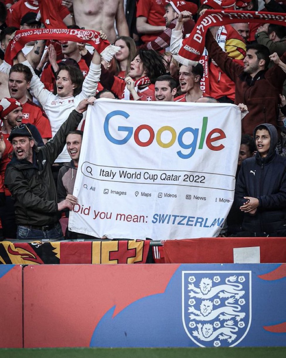 وسخرت جماهير سويسرا، من عدم تأهل المنتخب الإيطالي بطل يورو 2020 إلى بطولة كأس العالم 2022 للمرة الثانية على التوالي وذلك بعدما فشل أيضا في التأهل لبطولة مونديال روسيا 2018.