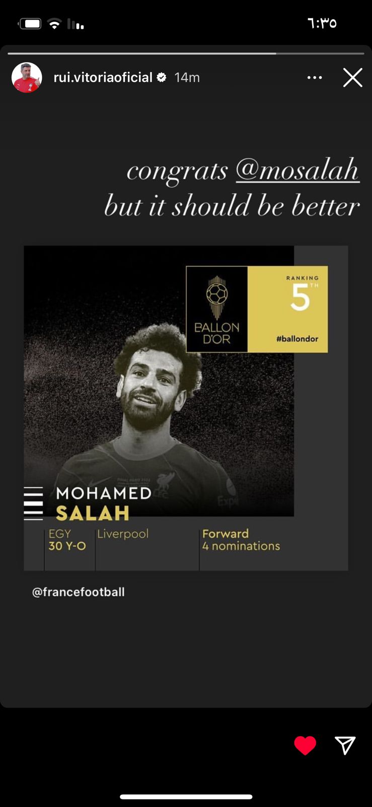 وكتب روي عبر حسابه الرسمي ب <انستجرام >: “مبروك صلاح ويجب أن تكون أفضل”.