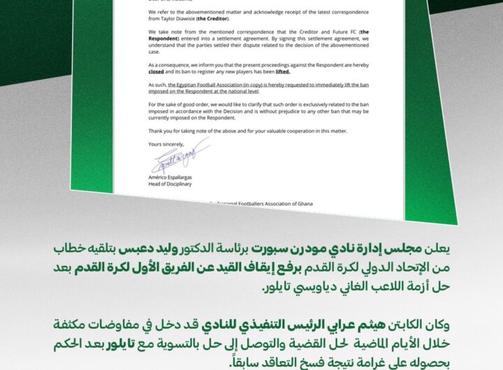 كتبت : نيره سيد آدم اعلن مجلس إدارة نادي مودرن سبورت برئاسة الدكتور وليد دعبس بتلقيه خطاب من الإتحاد الدولي لكرة القدم برفع...