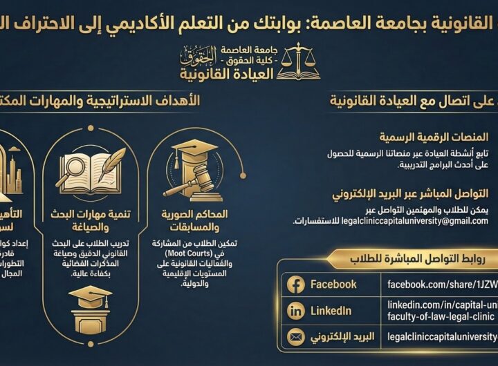 جامعة العاصمة تُطلق الصفحات الرسمية للعيادة القانونية بكلية الحقوق لتعزيز التدريب العملي وتأهيل الطلاب لسوق العمل القانوني مدارس وجامعات جامعة العاصمة تُطلق الصفحات الرسمية للعيادة القانونية بكلية الحقوق لتعزيز التدريب العملي وتأهيل الطلاب لسوق العمل القانوني إبراهيم مجدي 15 مارس، 2026 منى حسين في خطوة جديدة تعكس توجه جامعة العاصمة نحو تطوير منظومة التعليم القانوني وربط الدراسة الأكاديمية بالتطبيق العملي، أعلنت كلية الحقوق عن...المزيد