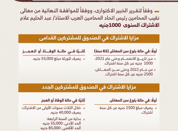 في إطار حرص نقابة المحامين على تعزيز منظومة الحماية الاجتماعية ودعم أعضائها، يبدأ العمل بالدراسة الجديدة لصندوق التكافل الاجتماعي اعتبارًا...